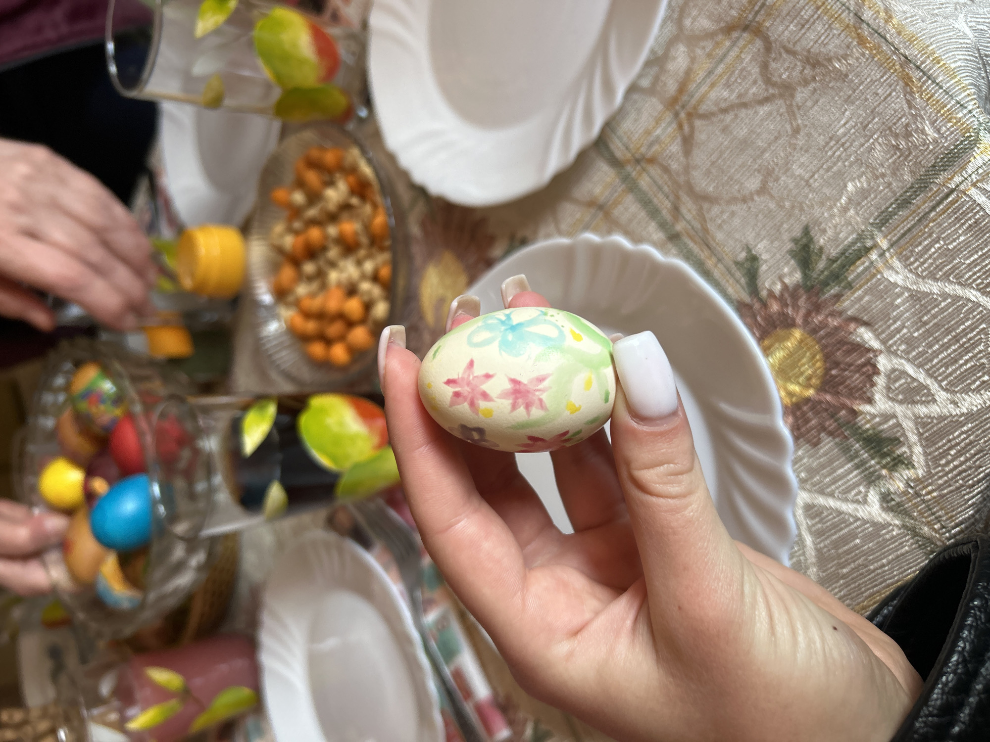 A hand holds a decorated egg in front of a table setting. The egg is decorated with blue and pink flowers, and green and yellow details. The hand has long, square white nails. On the table are several white plates, a glass bowl filled with colorful decorated eggs, and another bowl containing orange and white spherical objects, possibly candies or nuts. The tablecloth has a light floral pattern. Part of a person’s arm is visible on the left and a dark jacket on the right. The location cannot be determined from the provided visual information alone.