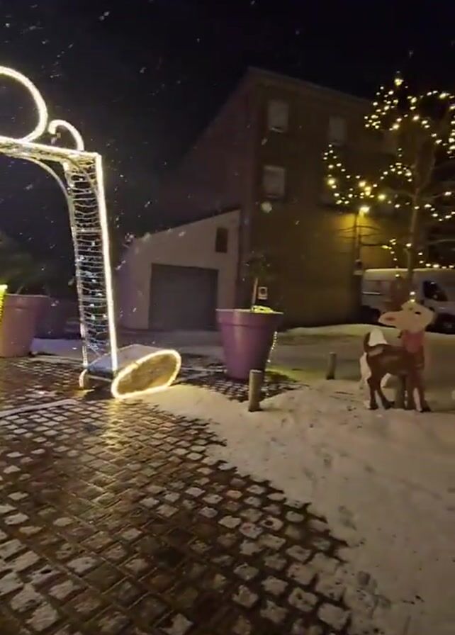 nighttime scene in a snow-covered town square decorated for Christmas. A large, illuminated gift box structure stands at the entrance to the square. A cut-out of a reindeer and a Christmas tree stand on the snowy ground. A large Christmas tree, decorated with white and gold lights, is also visible. Snow falls lightly throughout the scene. The ground is covered with snow and consists of a cobblestone-like pattern. Buildings are seen in the background, and other trees are decorated with lights. The scene is illuminated by Christmas lights and street lights.