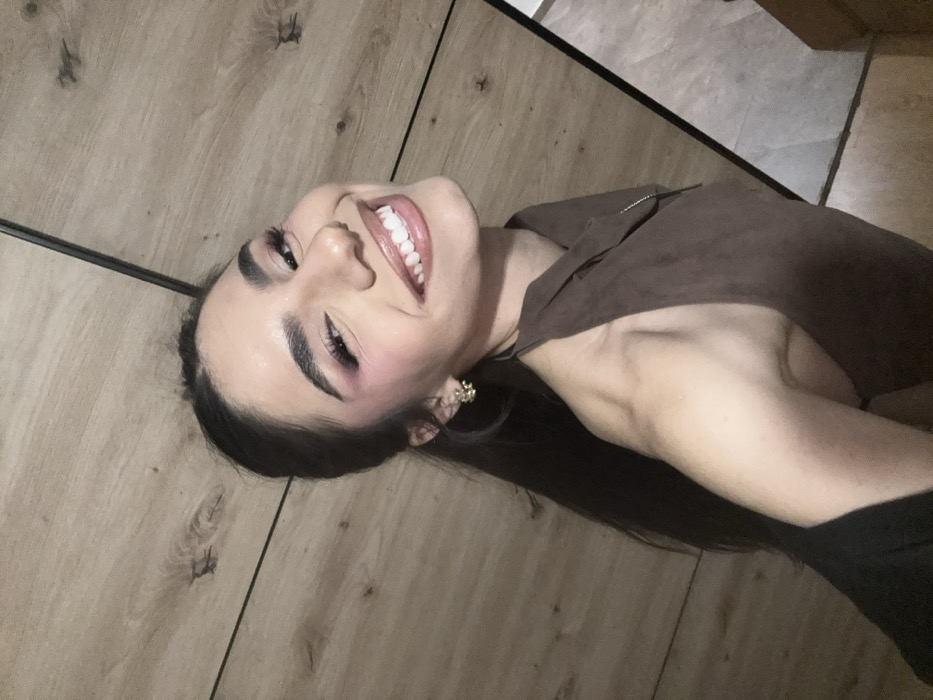 A young female subject, with olive skin, long dark hair in a ponytail, and prominent makeup including pink eyeshadow and glossy lips, smiles broadly towards the camera