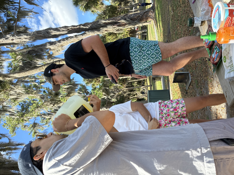 The image displays an outdoor scene in a park in Micanopy, United States, featuring three adult males gathered around a wooden picnic table under a clear blue sky. Large trees heavily draped with Spanish moss dominate the background. On the left, an individual wearing a grey t-shirt, sunglasses, and a dark baseball cap is drinking directly from a large, translucent plastic jug containing a yellow liquid. A gold-colored bracelet is visible on his right wrist. In the center, a second individual, partially obscured, wears a white t-shirt and pink, fruit-patterned shorts, standing with hands clasped. On the right, a third individual, wearing a black polo shirt, camouflage baseball cap, and teal swim trunks with a white anchor pattern, holds sunglasses in his left hand and looks towards the first individual with a slight smile. The picnic table in the foreground holds various items, including two packages of raw meat (one with a "Publix" label), a red bottle of Sriracha sauce, a container of "Friendly Farms" Low Fat Cottage Cheese, a package of tortillas or wraps, and several jars of condiments. A green trash receptacle is visible in the mid-ground. The ground consists of grass and scattered dry leaves. In the far background, another individual is faintly visible walking.