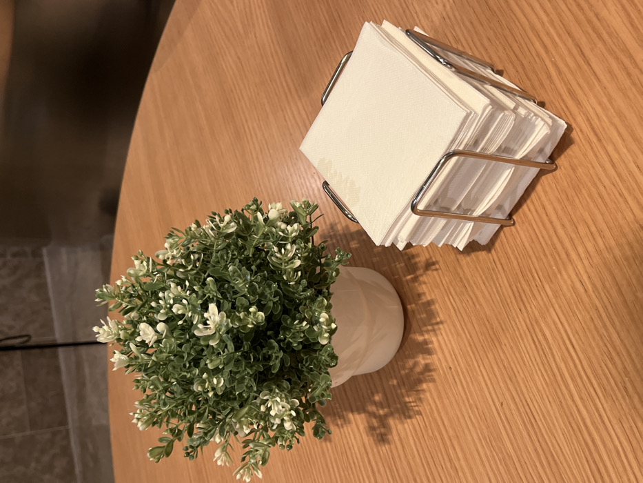 - "wooden table with a small potted plant and a metal napkin holder containing white napkins" by FM-lnhCZ2, licensed under CC BY 4.0