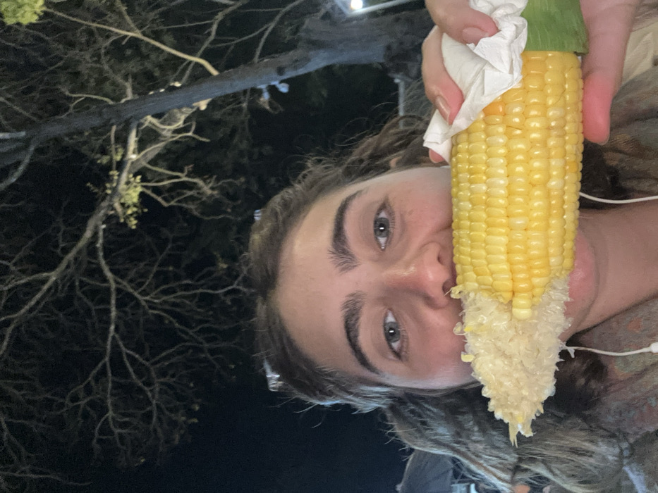 The image depicts a close-up, head-and-shoulders view of a young adult female observed at night, likely in an outdoor market setting in Luang Prabang, Laos. The subject has light skin, wavy brown hair, and blue eyes, and is looking directly into the camera. An ear of partially eaten yellow corn is held horizontally in front of her mouth by her left hand, obscuring her lower facial features. The corn shows an exposed white cob where kernels have been consumed, and the remainder is wrapped at its base with a white paper napkin and a green husk. White wired earbuds are visible in her ears, and sunglasses rest on top of her head. The background is dark, featuring the silhouetted branches of a large tree with sparse foliage, illuminated by multiple distant artificial light sources. A dark, umbrella-like structure is faintly discernible on the far left, suggesting a street food vendor or market stall.