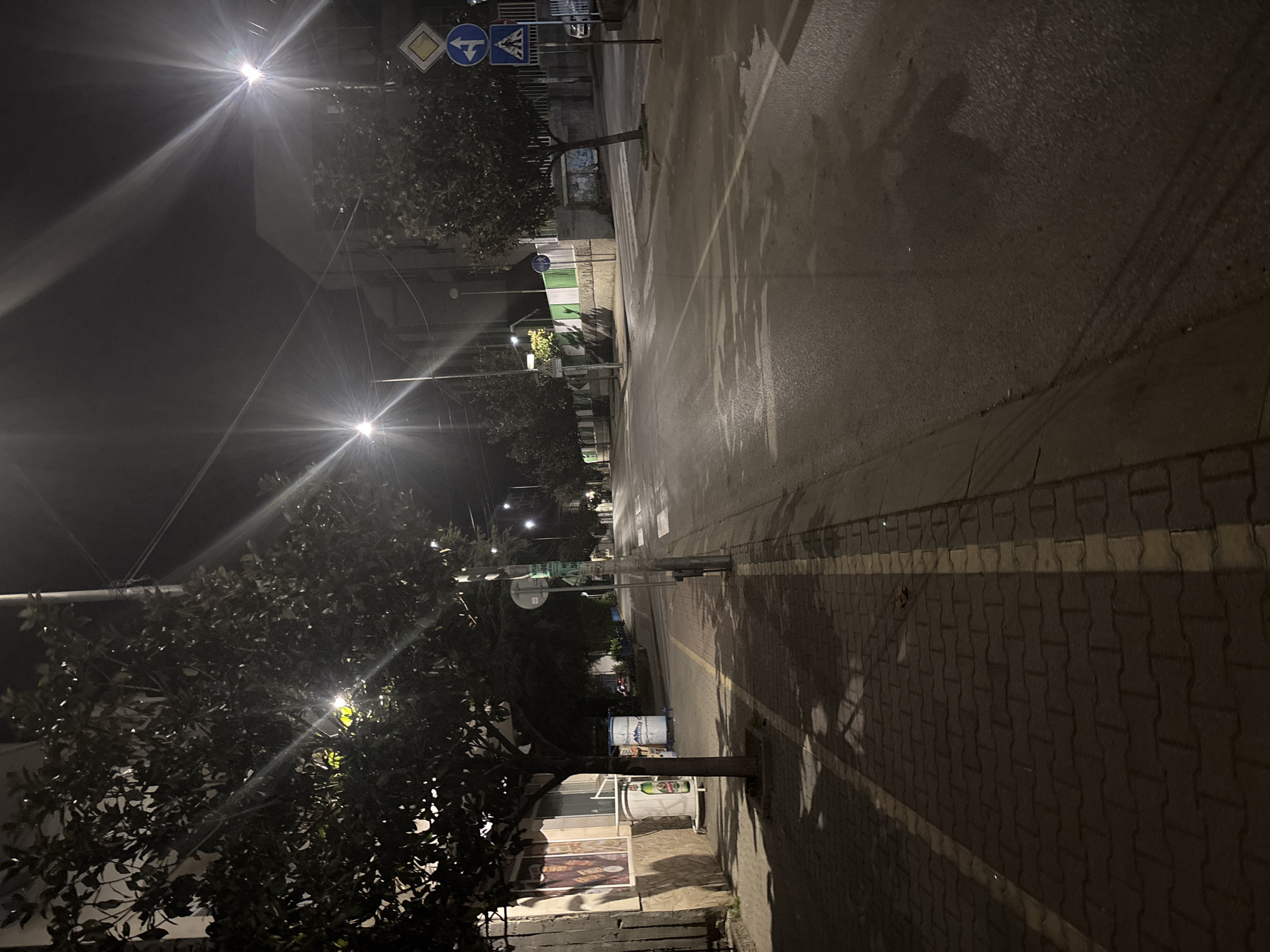 The image displays an empty urban street scene at night in Petrich, Bulgaria. The view is oriented down a straight asphalt road, flanked by sidewalks and buildings. On the immediate left, a brick-paved sidewalk features a tree with dense, dark foliage. Adjacent to this sidewalk is a building with a ground-level shopfront, characterized by display windows showing posters and two cylindrical advertising barrels; one barrel is white with a green beer logo. The sidewalk is delineated from the road by a faded yellow line. The asphalt road, which appears damp or reflective under the artificial light, has faded white line markings, including a continuous line along the right edge and broken lines further down, indicating a pedestrian crosswalk. On the right side of the street, another tree with dark foliage is visible, along with a utility pole. Attached to this pole are multiple traffic signs: a yellow diamond-shaped "priority road" sign, a blue circular "mandatory turn left" sign, and a blue square "pedestrian crossing" sign. Further down the right, a building facade with a green and white fence is visible, alongside another blue circular sign. Multiple streetlights, positioned along both sides of the street, emit bright white light, producing prominent starburst lens flares and casting strong shadows across the pavement and road. No individuals or active vehicles are visible within the immediate scene; a vehicle is faintly discernible parked in the far distance on the right side of the road.