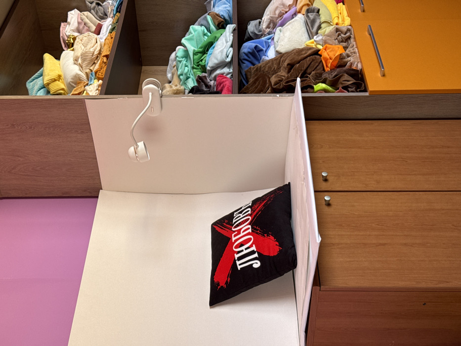 The image depicts an interior corner within a room located in Unknown, Bulgaria. On the left, a light-brown wooden cabinet with two silver circular handles supports a white seamless backdrop. Propped against this backdrop is a black rectangular pillow adorned with a large red 'X' and white Cyrillic text "ЛЮБОВЬ" (LYUBOV). The wall segment above this setup is purple. A white wall-mounted flexible-neck lamp is affixed to a vertical panel, directed towards the pillow. To the right, a multi-shelf wooden unit is densely packed with various colorful folded and stacked textiles and clothing items. Below these shelves are two orange cabinet doors, each equipped with a horizontal silver bar handle. A dark brown wooden panel forms the upper right background, likely part of the cabinetry.