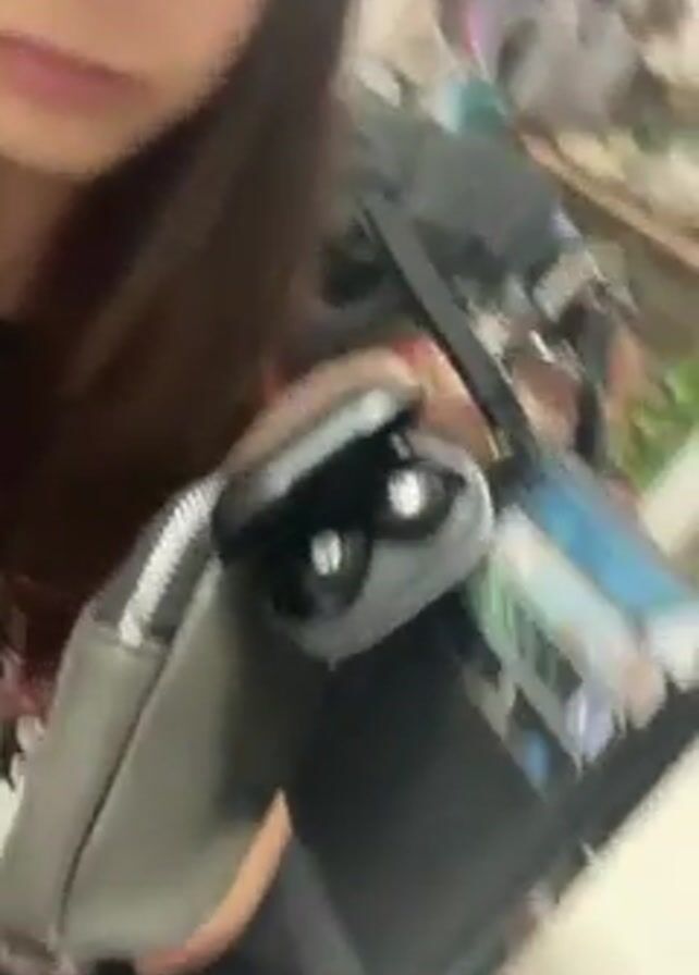 A woman with long brown hair with red highlights smiles into the camera. She holds a small grey purse and a pair of open wireless earbuds in their case in front of her, then manipulates a set of pink and white hair clips. The background is a cluttered shelf and possibly the corner of a desk or table.