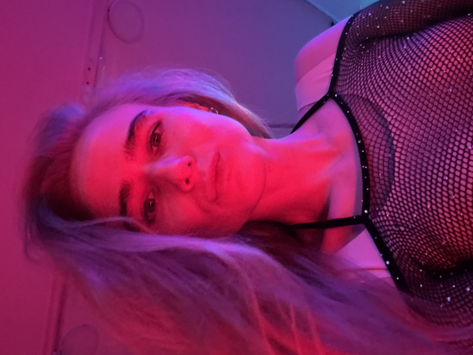 A woman with fair skin and blonde hair reclines, gazing directly at the viewer. The scene is illuminated by vibrant pink and blue lighting. She wears a black mesh top adorned with small, reflective embellishments. Her expression is neutral, and her head is tilted to the side, with her hair cascading around her face and shoulders. The background is minimally visible, suggesting an indoor setting with a plain wall.