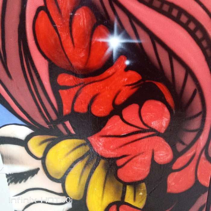 A vibrant close-up features a mural with bold, cartoonish floral elements. Red and yellow petals, outlined in thick black, intertwine against a dark background. A striking white starburst accentuates the red area. The overall style is reminiscent of pop art, with flat colors and defined contours. The "Infinix HOT 30i" watermark appears at the bottom, suggesting the image was captured on this device.