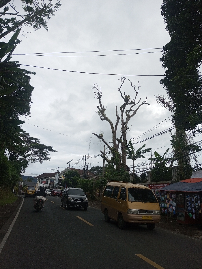 This image captures a street scene in the city of Sandamal Eliya, Sri Lanka, under a heavily overcast sky. The asphalt road features a solid white line defining its left edge and a double yellow line marking the center for two-way traffic. In the foreground, a gold-colored Suzuki van, bearing license plate F 1914 ZK, is positioned in the right lane, moving from right to left. Slightly behind and to the left of the van, a black multi-purpose vehicle (MPV) with license plate F 1914 ZL proceeds in the same direction. Further down the left lane, a single individual wearing a dark jacket rides a white motorcycle, also traveling from right to left. A yellow car is visible in the far background on the left, moving away from the viewer. To the right of the road, a small commercial stall or kiosk with a dark canopy displays various items. A large, multi-trunked deciduous tree, primarily denuded of leaves with numerous bare branches and some epiphytic growth, stands centrally in the midground. Lush green foliage, including banana plants, lines the left side of the road, while tall, dense green trees obscure the view on the far right. Numerous utility poles and overhead power lines traverse the upper portion of the frame. In the background on the left, several buildings with light-colored facades and pitched roofs are visible, interspersed with trees.