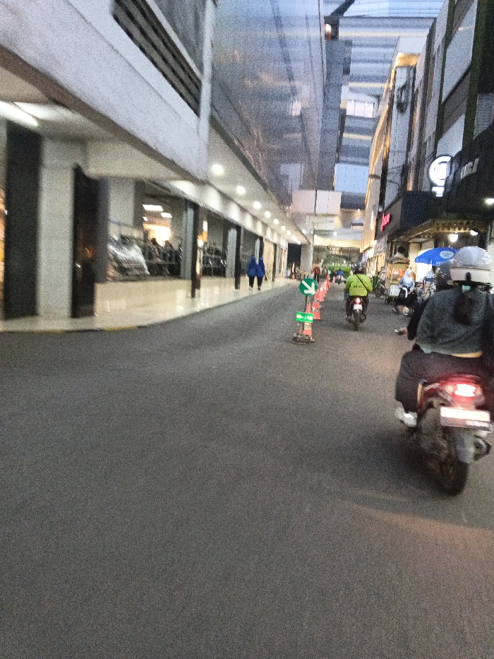 The image depicts a street scene in a commercial district of Bandung City, Indonesia, likely along Jalan Merdeka or Jalan Purnawarman, during late afternoon or early evening. The perspective is from slightly above ground level, facing forward in the direction of travel. On the left side of the street, a multi-story modern building with a light-colored facade features a deep overhang, creating a covered pedestrian walkway at ground level. This walkway is illuminated by evenly spaced ceiling lights and contains recessed storefronts. One individual, wearing a blue hijab and dark clothing, is visible walking away from the camera along this path. Further into the background, other indistinct figures are visible within the illuminated storefronts. On the right side of the street, a series of older commercial buildings house various businesses. One storefront features a blue sun umbrella extended outwards. Multiple individuals are present near these establishments, some standing, some partially obscured. A white circular sign is visible above one shop. The asphalt road surface occupies the central and foreground portions of the image. A line of orange traffic cones, each equipped with a green and white directional arrow pointing to the left, is placed along the center-right of the roadway, indicating a lane division or temporary traffic guidance. One cone appears to be on its side near the foreground. In the immediate foreground on the right, the rear of a dark-colored scooter or motorcycle is visible. Its red brake light is illuminated. The rider is wearing a dark jacket, dark trousers, and a white helmet with a dark visor. The rear wheel and fender of this vehicle appear dirty. Further into the midground, a second motorcycle is observed, ridden by an individual wearing a bright lime green or yellow jacket and a dark helmet, traveling in the same direction as the foreground motorcycle. Additional blurred vehicles and pedestrians are discernible further down the street, indicating ongoing urban activity.