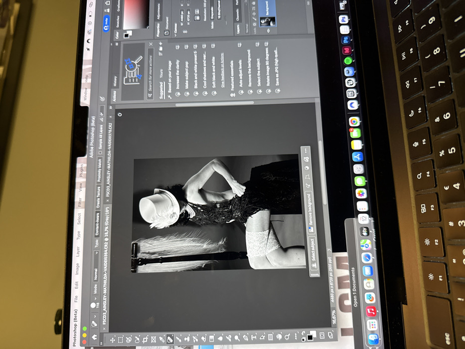 A laptop screen displays the Adobe Photoshop interface with two image files open. The primary focus is on a black and white photograph of a woman in a hat, feather boa, and stockings. She is positioned against a dark background. Editing tools and suggestions are visible on the right panel, including options like "Increase the clarity," "Black and white preset 5," and "Remove the background." The bottom of the screen reveals the image dimensions. The laptop's keyboard is partially visible on the right side.