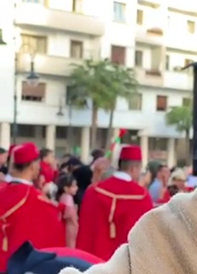 The video begins with a close-up of people wearing red robes and hats, walking in a crowded urban plaza. In the background, there are tall white buildings with windows, a palm tree, and a streetlight. A person's arm partially obscures the view in the foreground. Someone then raises a Moroccan flag. The camera angle shifts to the sky, then to a person's hands as they use a smartphone to take a photo of the parade. The scene ends with the smartphone screen showing the picture.