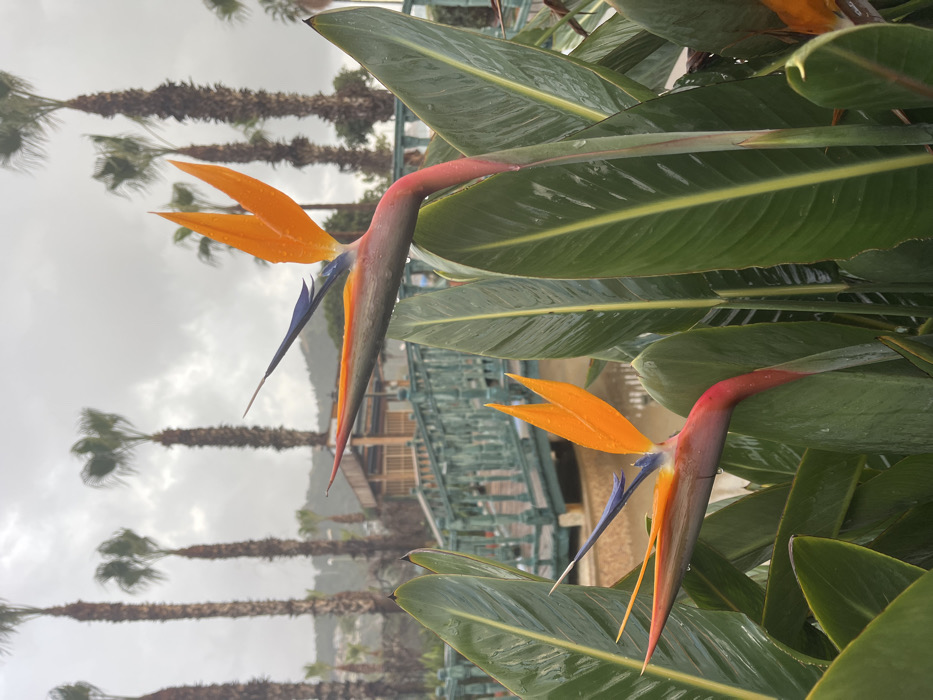 The image displays an outdoor, landscaped environment in Alanya, Turkey, under an overcast sky. In the foreground, two Strelitzia reginae (Bird of Paradise) flowers are prominent, exhibiting vibrant orange, blue, and reddish-pink hues. Their large, green, paddle-shaped leaves are visibly wet with water droplets. In the midground, a teal-painted wooden footbridge with decorative railings spans a body of water, leading towards a light-colored wooden structure featuring a multi-tiered roof. The background reveals multiple tall palm trees and a verdant hillside. No human subjects are present in the scene.