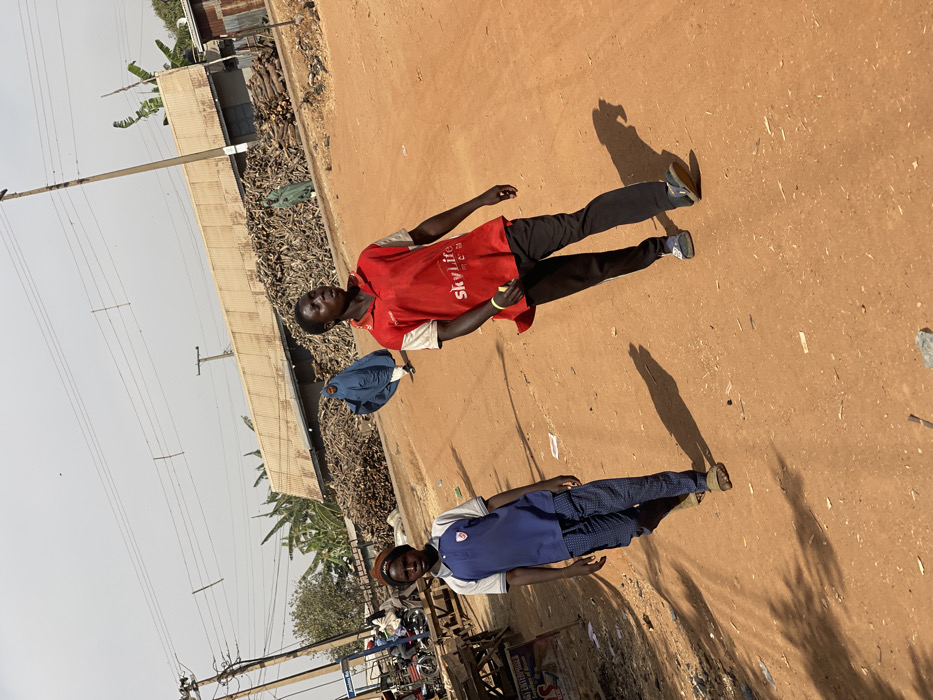 The scene depicts a daytime view of a dirt road in Muchiya, Nigeria