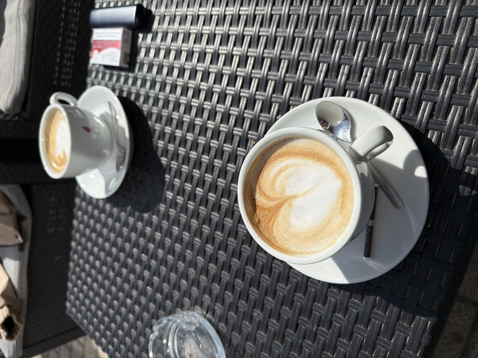 The scene depicts an outdoor cafe table in Plovdiv, Bulgaria, under bright sunlight