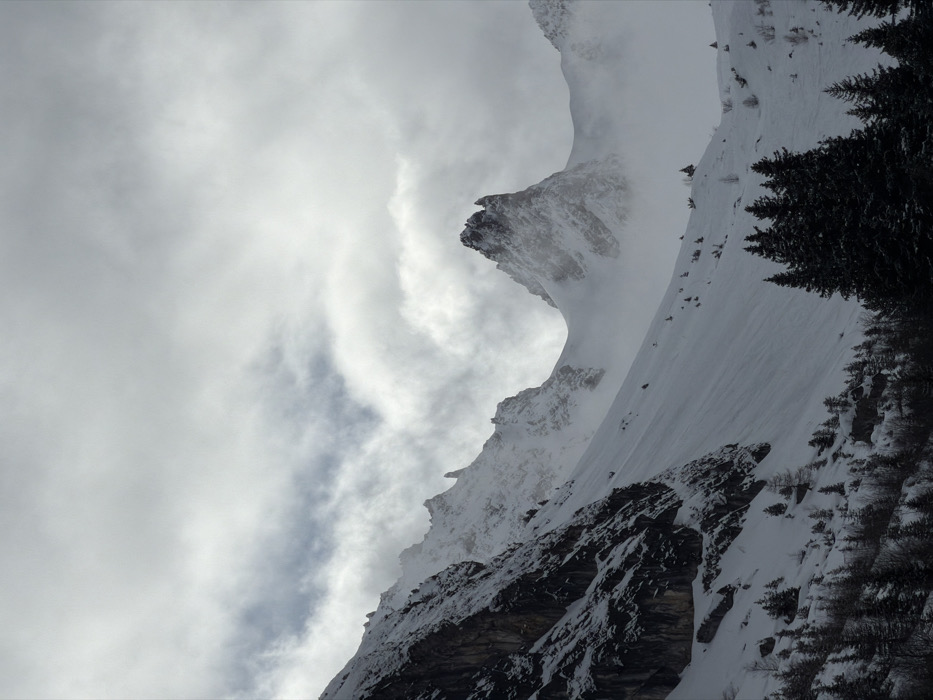 The image displays a snow-covered alpine landscape within the city of Courchevel, France. The scene is dominated by rugged, snow-dusted mountains and a heavily overcast sky. The upper portion of the frame is filled with thick, grey and white clouds, exhibiting variations in density and texture. On the left, a steep, dark rock face, partially clad in snow, rises prominently. In the mid-ground, a distinctive, jagged rock pinnacle, also covered in snow and partially enveloped by low-lying mist or clouds, stands as a central feature. A broad, snow-covered slope descends from the mid-ground towards the foreground, sparsely dotted with individual evergreen trees and some deciduous trees. The immediate foreground on the right features a dense cluster of dark evergreen trees, suggesting a forest edge. No human subjects, artificial structures, or overt signs of human activity are present. The overall lighting is diffused, indicating an overcast winter day with significant atmospheric moisture.