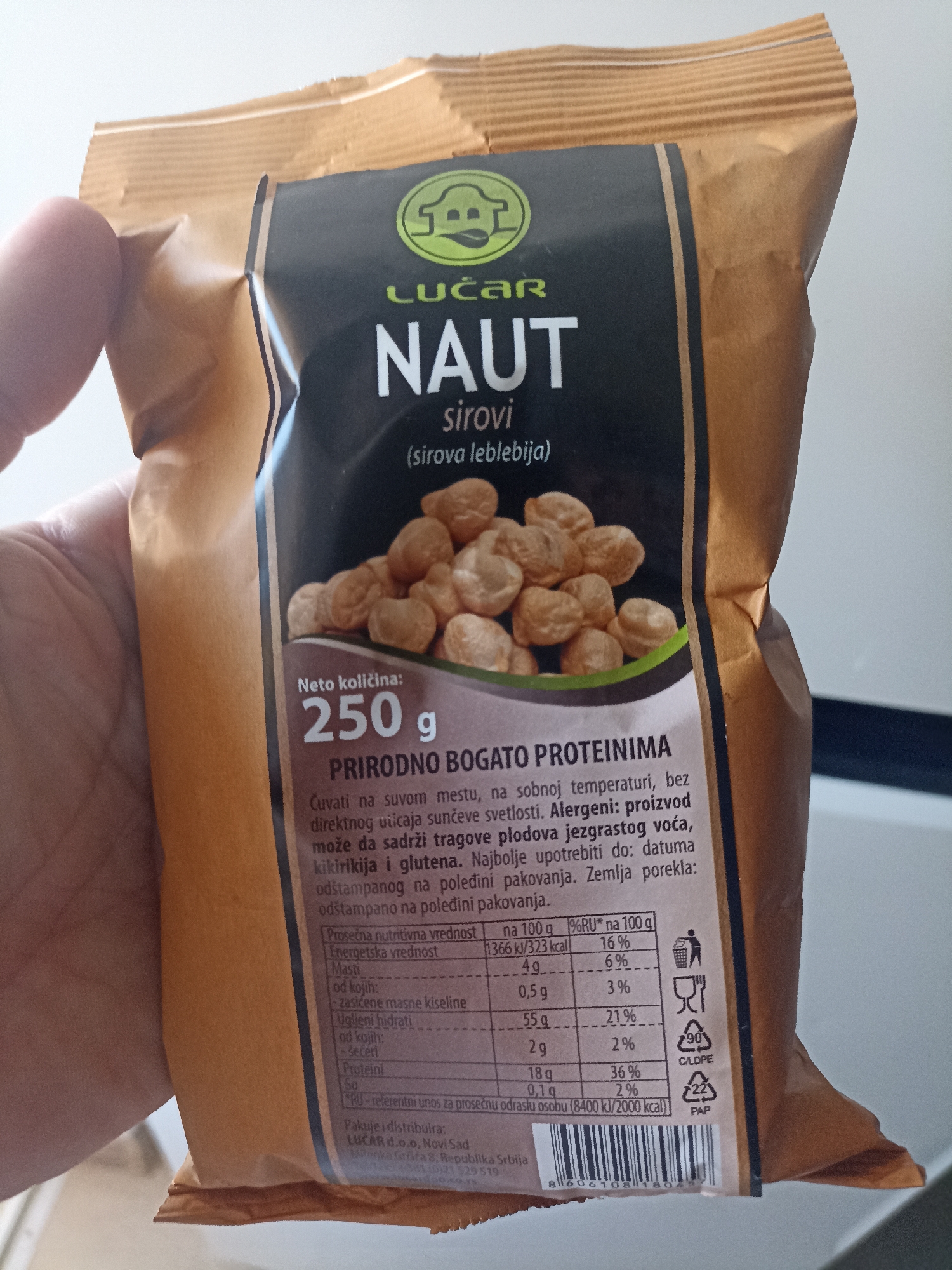 - "A close-up image depicts a light-skinned left human hand holding a 250g brown kraft-paper style stand-up pouch package of "LUČAR NAUT sirovi (leblebija)" (LUČAR Raw Chickpeas)" by FM-7wfYm1, licensed under CC BY 4.0