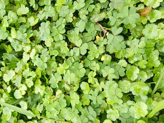 Lush greenery covers the frame, dominated by clover-like plants with trifoliate leaves, interspersed with rounder, slightly lobed leaves
