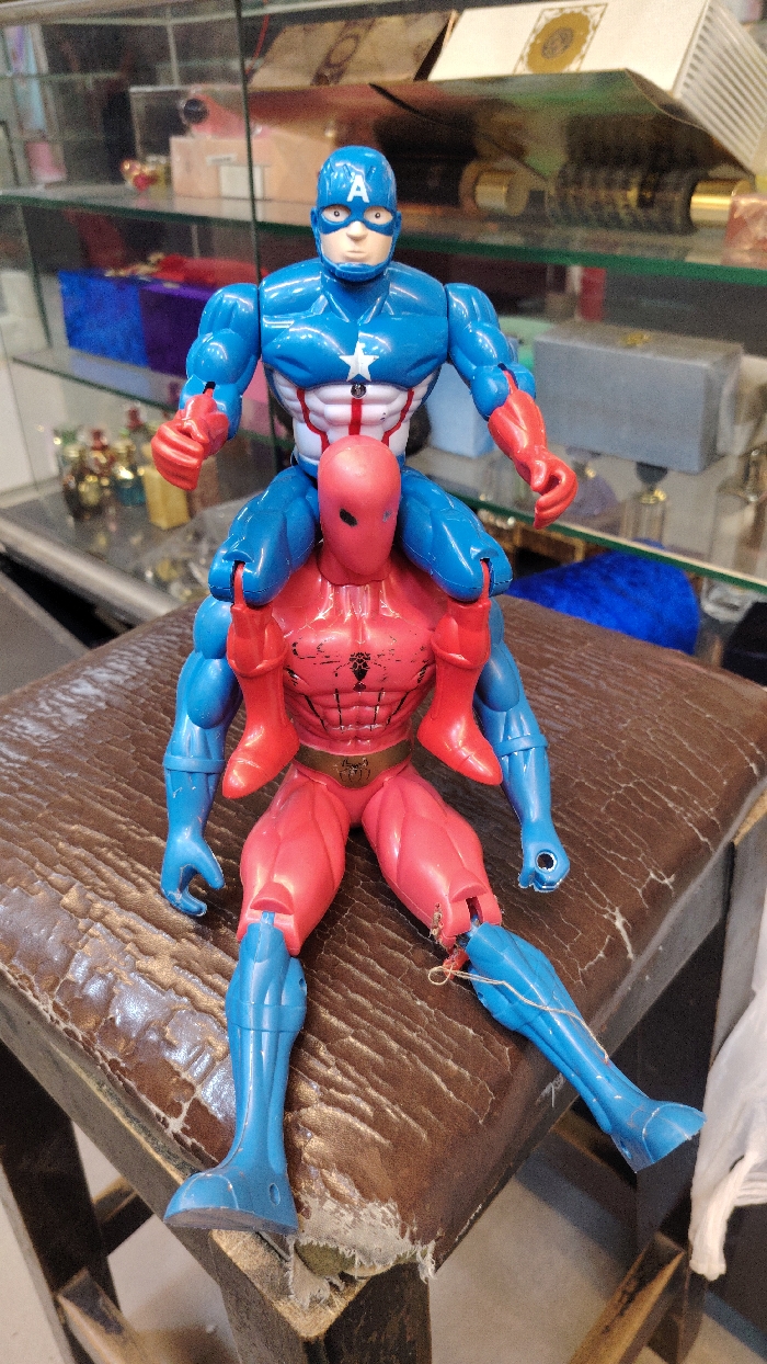 An interior view depicts two plastic action figures positioned on a worn, brown, upholstered stool or low bench within what appears to be a retail setting or a room with display cases, in Barza Municipality, Syria. The top action figure, resembling Captain America, is predominantly blue with red forearms and boots, a white chest star, and an 'A' on its helmet; it is seated on the shoulders of the lower figure. The lower figure, resembling Spider-Man, is primarily red with blue limbs, a dark spider emblem on its chest, and a gold-colored belt buckle with a spider design. This lower figure is seated on the stool. Its left leg appears detached, secured by a thin wire or string. Several limbs of both figures show signs of articulation points. In the blurred background, clear glass display shelves hold various objects, including what appear to be perfume bottles and decorative boxes, some with gold accents. The stool's upholstery shows significant wear, tearing, and exposed underlayers along its edges.