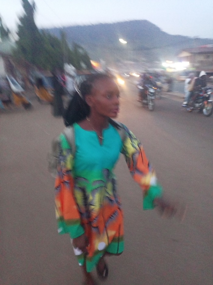 A young woman is walking on a street, wearing a colorful dress with orange, green, and blue hues, and a backpack. The background is blurred, but it appears to be a busy street with motorbikes and people. There is a hill in the distance and the lighting suggests it is dusk or dawn. The woman is looking off to the side.