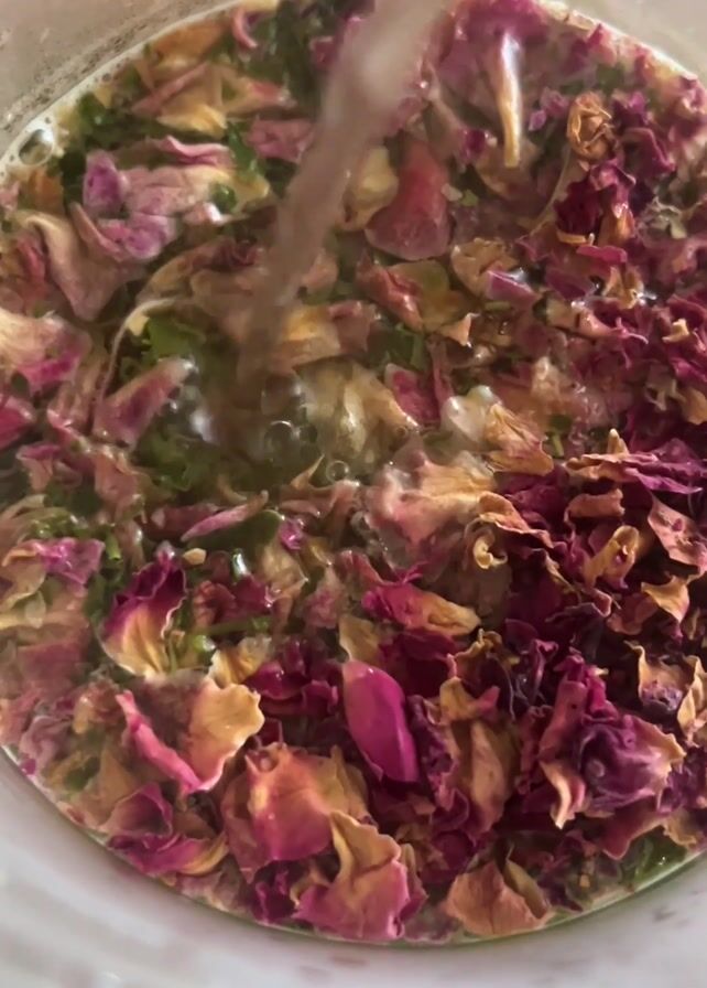 - "someone pouring water into a glass container filled with rose petals and green leaves" by FM-NHy3m1, licensed under CC BY 4.0