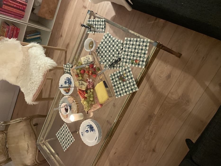 A glass-topped table is laden with snacks: cheeses, grapes, strawberries, and meats on a wooden board. A small bowl of dip, crackers, and a lit candle sit on a patterned plate. A stack of plates is nearby. Green and white checkered napkins, some with strawberries, are scattered on the table. The table is placed on a wood floor, near a chair with a white fur cushion and a shelf filled with books. A dark couch is visible.