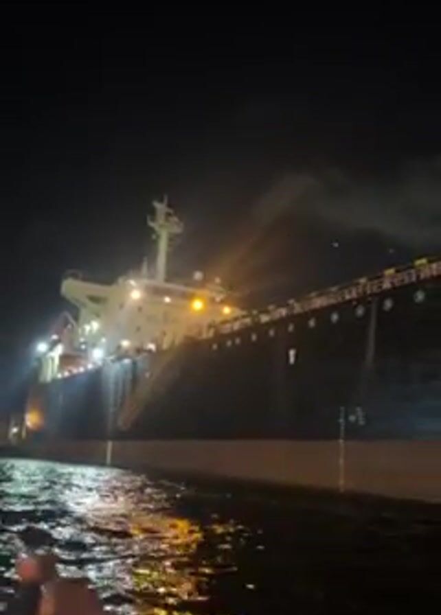The video, shot at night, shows a large cargo ship illuminated by bright lights