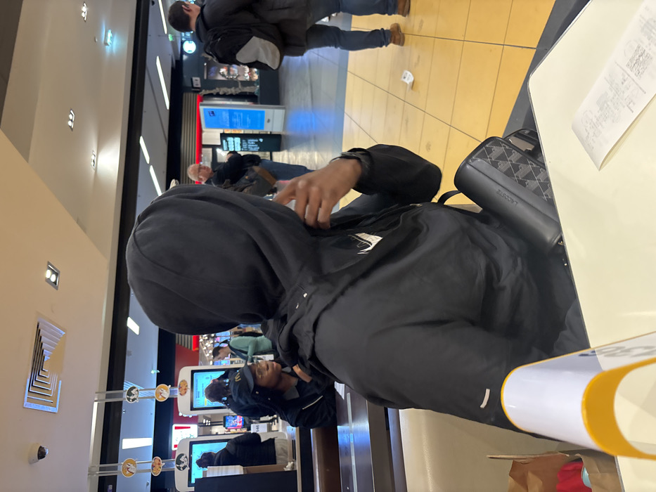 This image depicts the interior of a McDonald's restaurant, located in Strasbourg, France. The scene is captured from behind and to the left of a primary subject, who is seated at a light-colored table. The primary subject, of indeterminate gender, is wearing a black hooded jacket with a white logo (resembling a Nike swoosh) visible on the left chest. A black Lacoste shoulder bag with a geometric pattern in gray is positioned next to them on the bench. Their right hand is raised near their face, appearing to adjust the hood or touch their ear. On the table in front of them, a crumpled white paper receipt is visible. A white and yellow object, possibly a menu stand or tray component, is partially visible in the bottom left foreground. To the left and slightly behind the primary subject, a person wearing a black McDonald's uniform shirt and a black cap with the yellow McDonald's "M" logo is seated at a booth. This individual wears glasses and has braids. Behind them, two illuminated self-service kiosks are visible, with other patrons interacting with them. The floor of the establishment is covered in light-colored tiles with prominent yellow squares. A small, crumpled piece of white paper rests on the floor in the middle-right. In the background, an older man with glasses, dressed in a dark jacket, stands facing left. Further to the right, another man with a black and gray backpack stands, facing away from the camera. The restaurant features a white ceiling with multiple recessed lights, ventilation grilles, and a visible security camera. Red and blue illuminated signage and commercial displays are present in the distant background, characteristic of a modern fast-food interior.