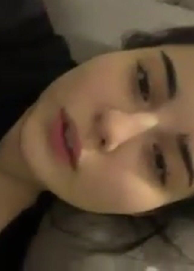 A young woman is lying in bed, looking at the camera. She has dark hair and fair skin. She is wearing a black shirt. She looks tired and is blinking slowly. She puckers her lips slightly. The bed has a gray and white patterned comforter. An earbud and a phone are visible on the bed behind her head.