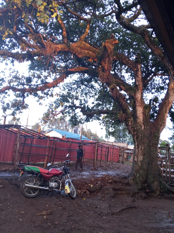A large tree dominates the scene, its moss-covered trunk and sprawling branches filled with epiphyte growth. To the left, a motorcycle is parked on muddy ground, near a red, corrugated iron structure with a timber frame. A man stands between the motorcycle and the building. A building with a blue roof peeks out from behind the fence and other green trees. The light is soft, suggesting early morning or late afternoon.