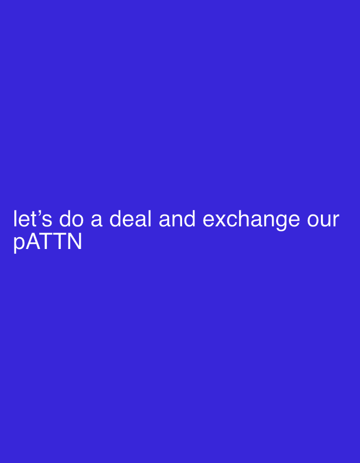 The image, associated with the city of At-Tall, Syria, is a digital graphic featuring a uniform royal blue background. White sans-serif text is positioned in the lower-left quadrant. The text reads: "let's do a deal and exchange our pATTN". No individuals, physical objects beyond the digital text, actions, or interactions are depicted within the frame. The visual environment is limited to the solid color background and the overlaid text.