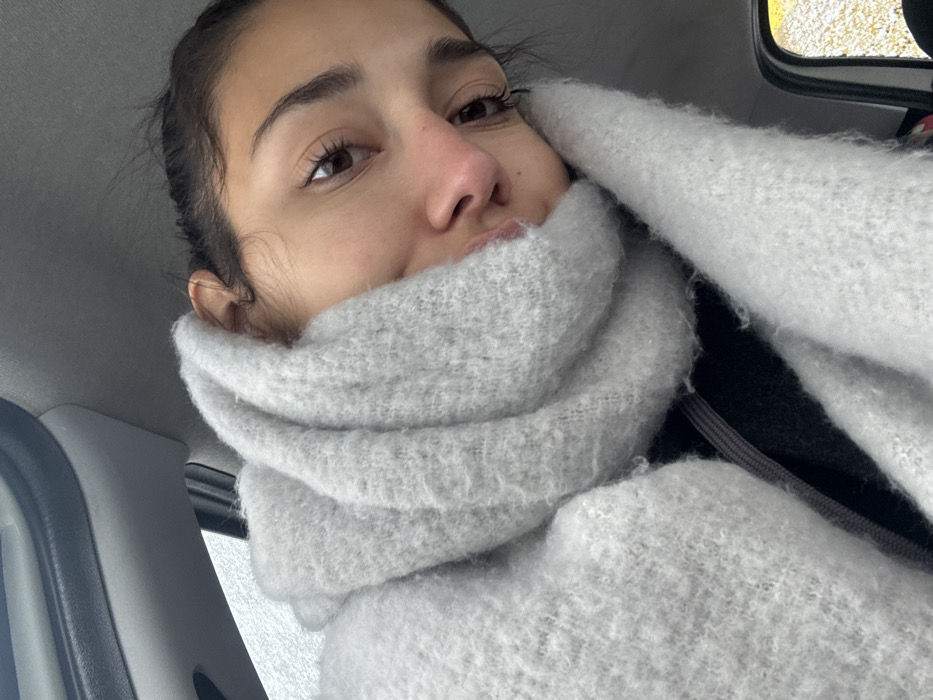 A woman is seen from a low angle, wearing a thick, light grey scarf that covers most of her face. Her eyes and nose are visible, along with a slight smile. She has dark hair pulled back, and fair skin. The setting appears to be inside a car, with a window visible in the upper right corner and part of the dashboard on the left.