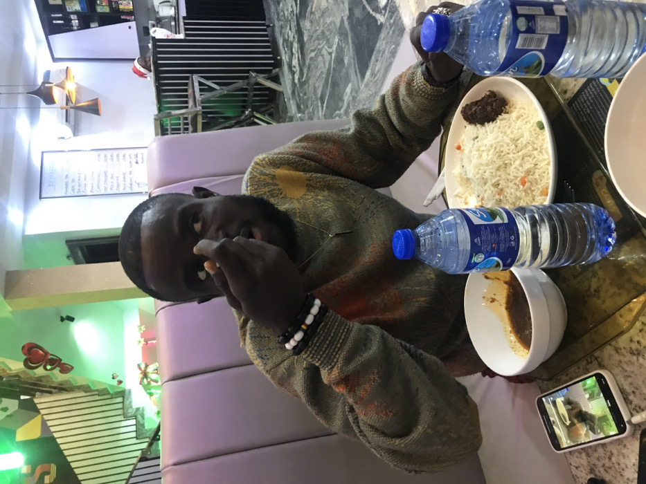 A man sits at a table with food, two bottles of water, and a phone. He is wearing a sweater and beaded bracelets, holding food in his hand. On the table is a plate of rice with a meat topping and a bowl of stew. A white phone sits next to the bowl, playing a video. The dining area has lilac seating and decorative features. A menu board is visible in the background.
