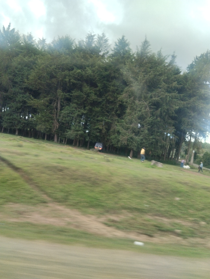 The image displays an outdoor scene in Kinale ward, Kenya, under an overcast sky. A dense forest line composed of tall coniferous trees forms the background. In the foreground, a blurred dirt road surface occupies the lower portion of the frame, indicating motion at the time of capture. An ascending grassy slope dominates the midground, featuring patches of green and dry brown vegetation. On the upper section of this slope, near the tree line, a dark-colored utility vehicle, resembling an SUV or pickup truck, is partially visible and appears stationary, with its headlights or taillights illuminated. Four individuals are present on the grassy slope. One person, wearing a yellow top and dark trousers, is walking rightwards towards the center of the slope. Further to their right, another individual in a light blue top is standing near a distinct white bag or sack. A third person, clad in dark attire, walks rightwards on the far-right side of the slope. A fourth individual is partially visible near the white bag. A defined dirt path or track traverses the lower-left portion of the grassy slope. The overall environment is characterized by natural terrain and rural vegetation.