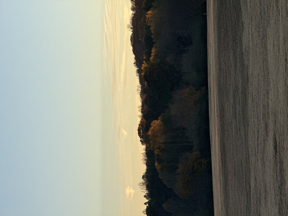 A landscape view with a light blue sky on the left, transitioning to a golden horizon. A dark treeline with hints of autumn foliage runs horizontally across the middle. To the right, a beige field with vertical lines dominates, suggesting plowing or rows of crops. The scene is bathed in a soft, diffused light, indicating either sunrise or sunset.