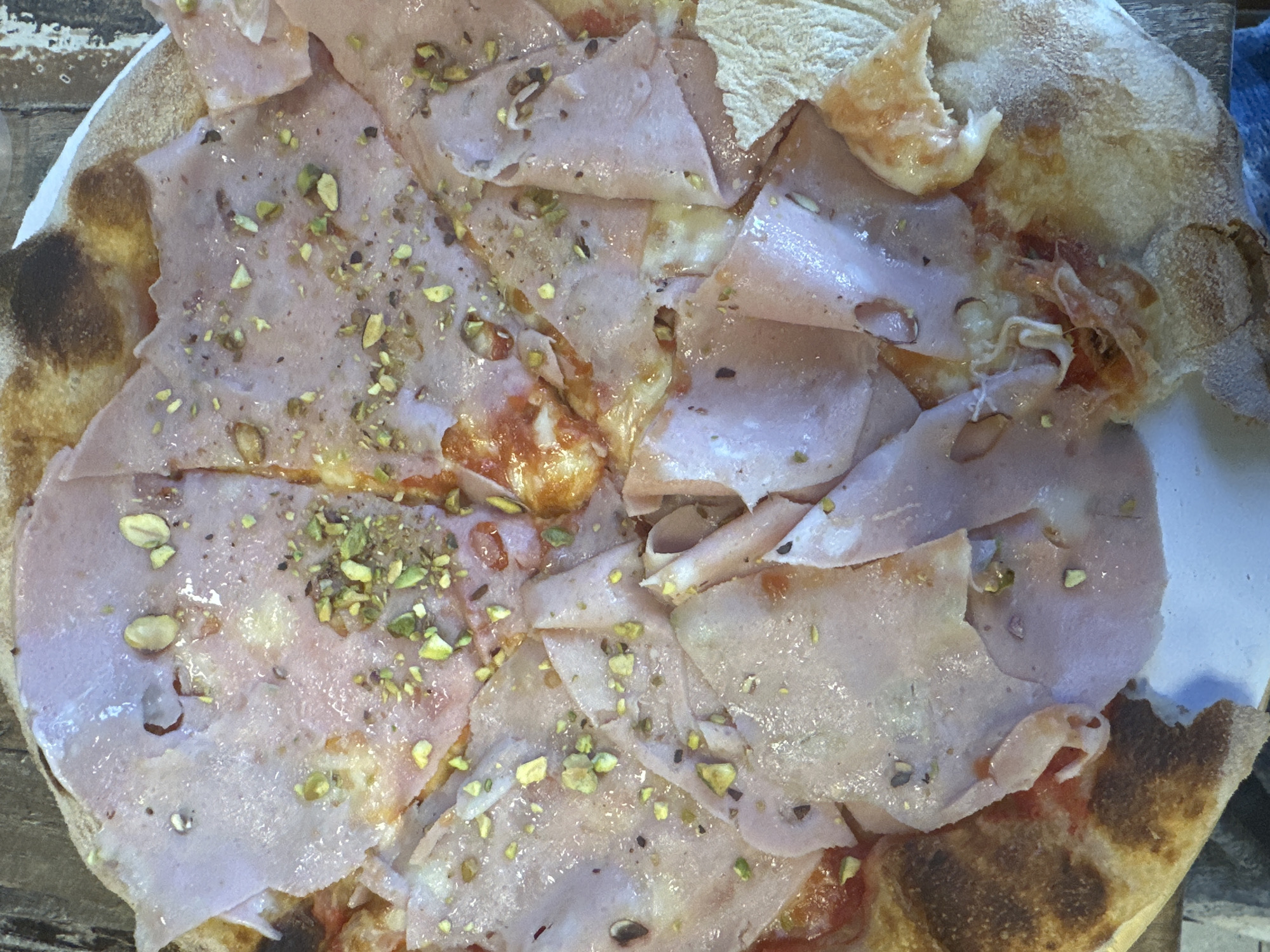 A top-down, close-up view displays a whole, oven-baked pizza, sliced into multiple pieces. The pizza is heavily topped with large, irregularly shaped slices of light pink cured meat, consistent with ham or mortadella, layered over melted white cheese and areas of red tomato sauce. A sparse, uneven distribution of small, chopped green pistachios is scattered across the meat and cheese. The pizza crust is golden brown with visible dark charring on the outer edge, indicating a high-temperature bake. The pizza rests on a white, circular plate, which is partially visible. The background consists of a dark, textured surface, likely wood. No individuals are present, and no actions or interactions are depicted. The specific location in Bankya, Bulgaria, cannot be determined from the visual evidence provided.