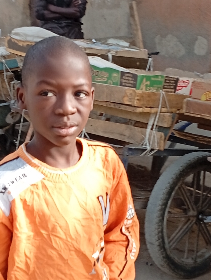 This image depicts an outdoor scene in Gayawa, Nigeria. A young male subject, approximately 8-12 years of age, with dark skin and a close-cropped haircut, occupies the foreground, looking slightly towards the viewer's right with a neutral expression. He wears an orange long-sleeved shirt featuring white and grey accents on the shoulders and sleeves, including a basketball motif on the right sleeve. In the upper left background, a portion of an adult male in dark attire is visible, appearing to be seated or crouched with arms crossed. The midground contains a structure composed of stacked wooden pallets or planks, upon which various cardboard boxes are placed. Identifiable text on one box reads 'M-PLUS' on a green background. To the far right, a spoked wheel with a dark tire is visible, consistent with a cart or bicycle. The immediate environment includes an uneven ground surface and a light-colored, weathered wall in the distant background. The scene is under natural daylight conditions.