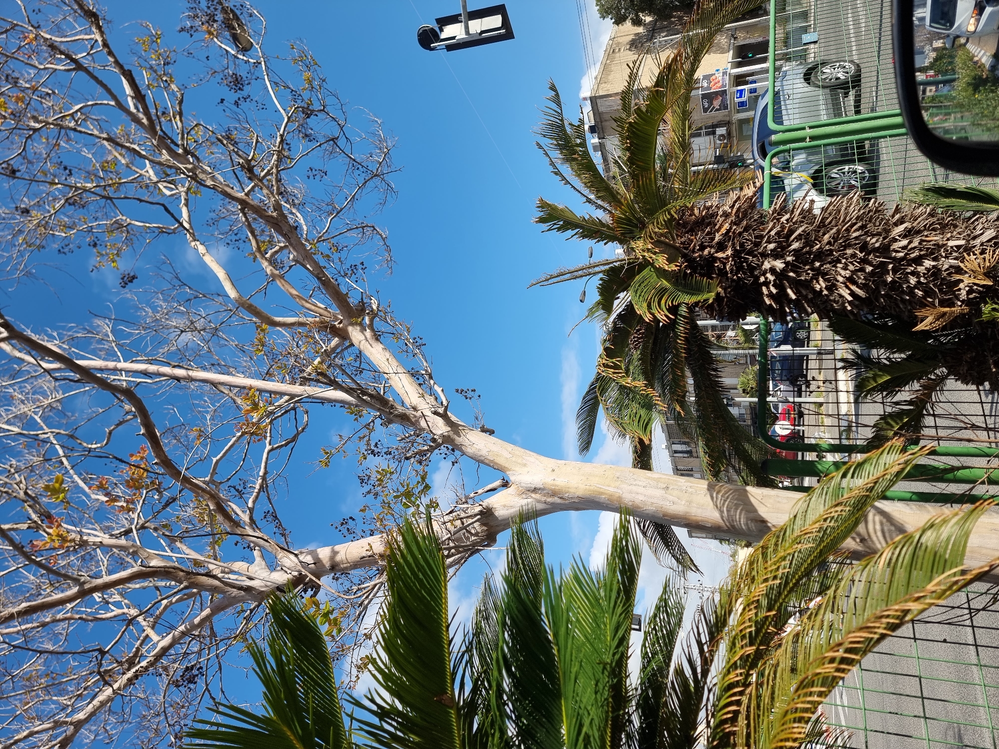 Captured from a low angle, the image presents a scene in Givatayim, Israel, showcasing a juxtaposition of natural elements and urban infrastructure. The focal point features two distinct trees: one with a light-colored bark and sparse branches, and a palm tree with a textured trunk and vibrant green fronds. They stand in contrast to the clear blue sky, with a few scattered clouds. A street light fixture hangs in the upper center of the frame. Buildings are visible in the background, obscured partially by the palm tree. A green fence parallels the street, with cars parked along the side. The reflection of the street scene is visible on the side mirror of a car. The overall perspective suggests the photograph was taken from ground level.