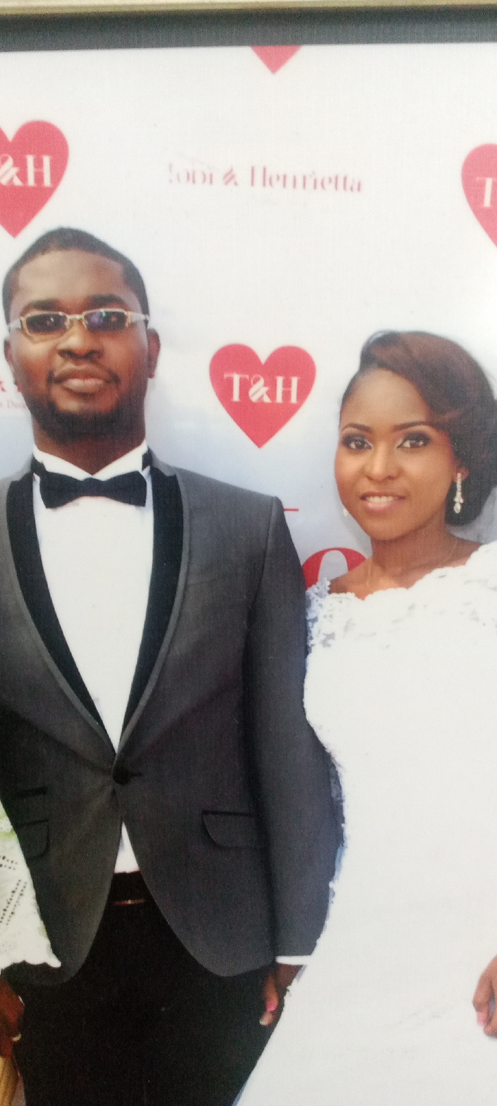 A wedding photo features a man and a woman standing closely. The man wears glasses, a black bow tie, and a gray suit with a black lapel. The woman is in a white wedding gown and earrings. Behind them is a white backdrop with red heart logos and the names "Tobi & Henrietta" printed in pink.