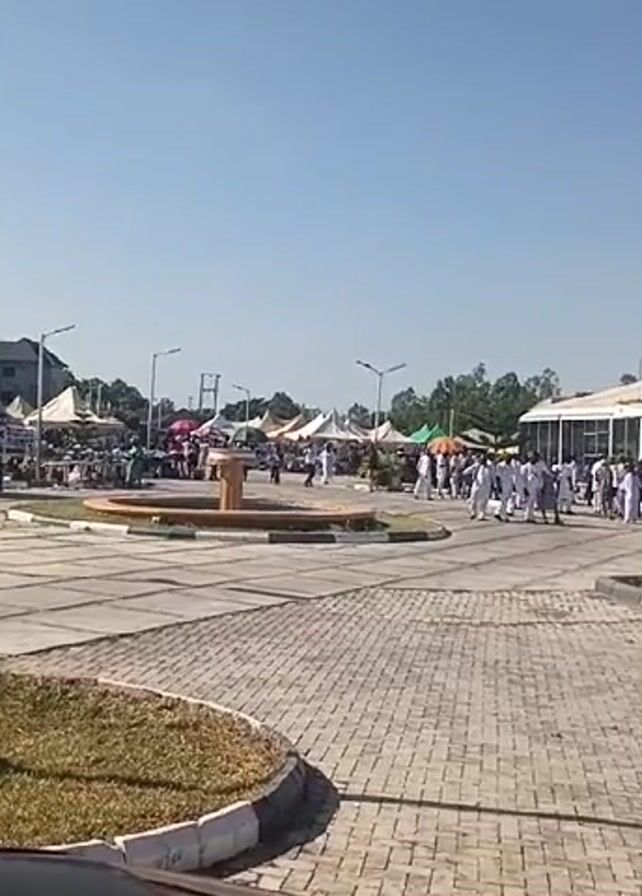 n outdoor area with a paved ground, tents lining the left side, and a building with large windows on the right. A fountain sits in the center of the area. People dressed in white robes are walking towards the building, while others walk around the tents. A uniformed figure is walking towards the left of the screen. The sky is clear and the scene is well-lit. Street lamps are scattered throughout the area. A white car is parked near the building on the right. The overall atmosphere appears to be that of an event or gathering.