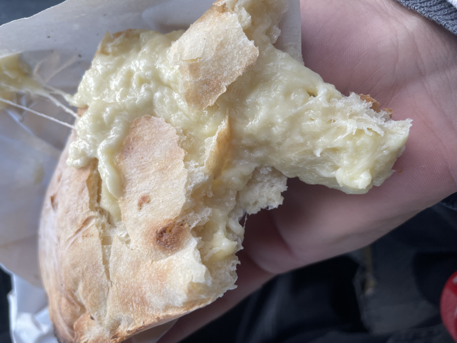 - "A light-skinned human hand holds a partially consumed piece of a baked good, consistent with Georgian Khachapuri, specifically a closed variety like Imeruli or Penovani" by FM-YBch83, licensed under CC BY 4.0