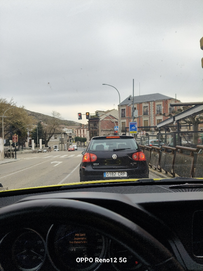 The image, captured from the driver's perspective inside a stationary vehicle, depicts a street scene in Cuéllar, Spain, specifically at an intersection on Calle San Francisco near the Jardines de la Soledad. In the immediate foreground, the top arc of a black steering wheel and a portion of a vehicle's dashboard are visible. A digital display on the dashboard reads "PRE-SAFE Inoperative See Owner's Mnl" and shows an ambient temperature of "1.5 °C". A "OPPO Reno12 5G" watermark is present in the lower right corner. Centered in the midground, directly ahead, is the rear of a black Volkswagen Golf hatchback (likely a Golf V generation) bearing Spanish license plate "0182 CRP". Its circular red brake lights are illuminated. The vehicle is stopped in a lane marked with a white painted left-turn arrow on the asphalt pavement. To the right of the Volkswagen, a metal barrier with rectangular infill panels runs parallel to the road. Beyond this barrier, a multi-story building with a reddish-orange brick facade, numerous rectangular windows, and a dark, possibly slate, roof is prominent. A traffic light displaying both a red and a yellow signal is mounted on a pole to the right, alongside a blue informational sign featuring white pictograms, including a boat. To the left of the Volkswagen, the road curves gently to the left and extends into the distance, where several other vehicles are visible. Trees with bare branches line the left side of the street, leading to a light-colored structure with visible columns, consistent with features of the Jardines de la Soledad. Hills or mountains are discernible in the distant background. The sky is uniformly overcast and light gray, indicating daytime conditions.