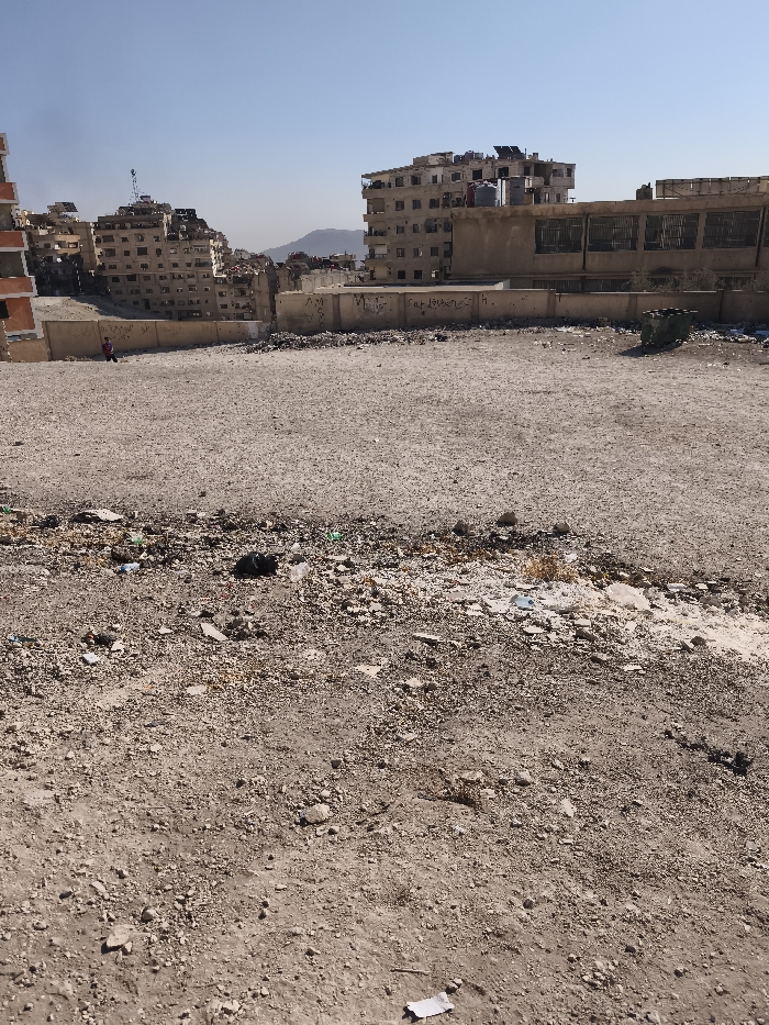The image depicts an expansive, unpaved, gravelly lot in At-Tall, Syria, under a clear, light blue sky