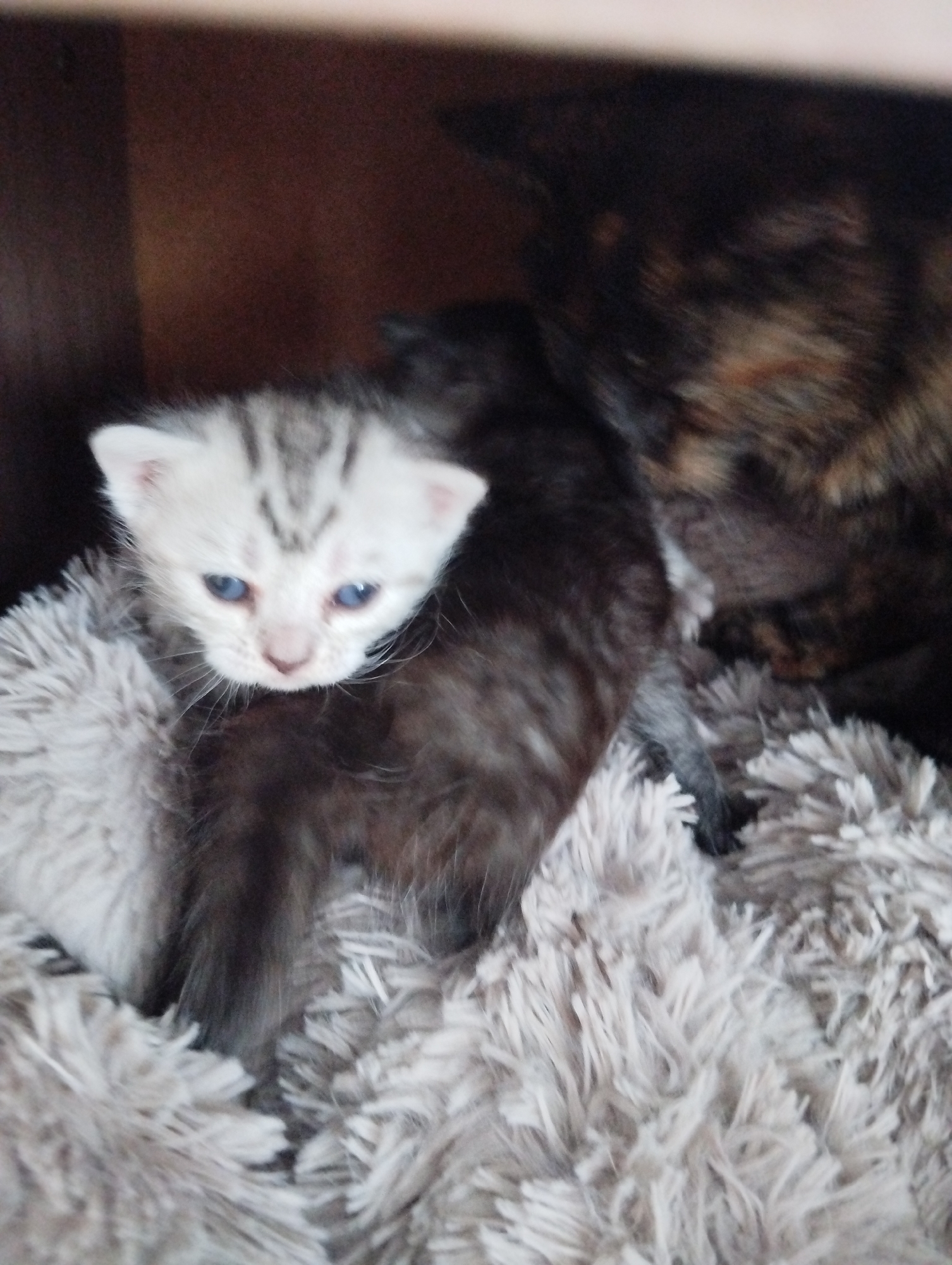 A small, light-gray and black tabby kitten with blue eyes is nestled in a soft, fluffy, light-gray blanket. Another kitten, mostly black, is behind it. The corner of a tortoiseshell cat is visible in the background on the right. The setting appears to be indoors, potentially in a box or confined space. The image was not taken in Krasnogorskoye, Russia.
