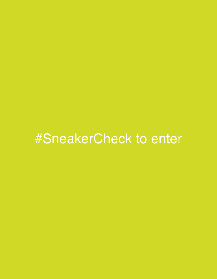 The image displays a uniform, monochromatic lime green background. Centered within this field is white sans-serif text. The text reads: "#SneakerCheck to enter". No other visual elements, people, subjects, objects, actions, or interactions are present. The image is a digital graphic and does not depict a physical location within Murino, Russia.