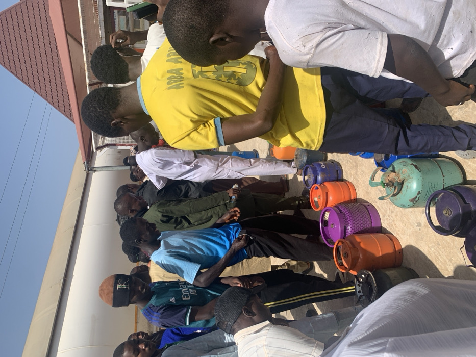 The image depicts an outdoor scene at a gas refilling or distribution point in Dutsinma B, Nigeria, under bright daylight conditions