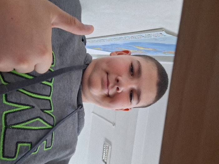 A male youth, approximately adolescent, with short dark hair and a light complexion, is captured in an upward-angle, indoor photograph