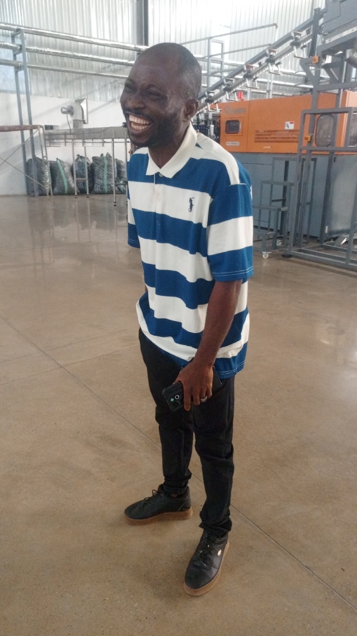 An adult male stands in what appears to be an industrial facility within the city of Bwari, Nigeria