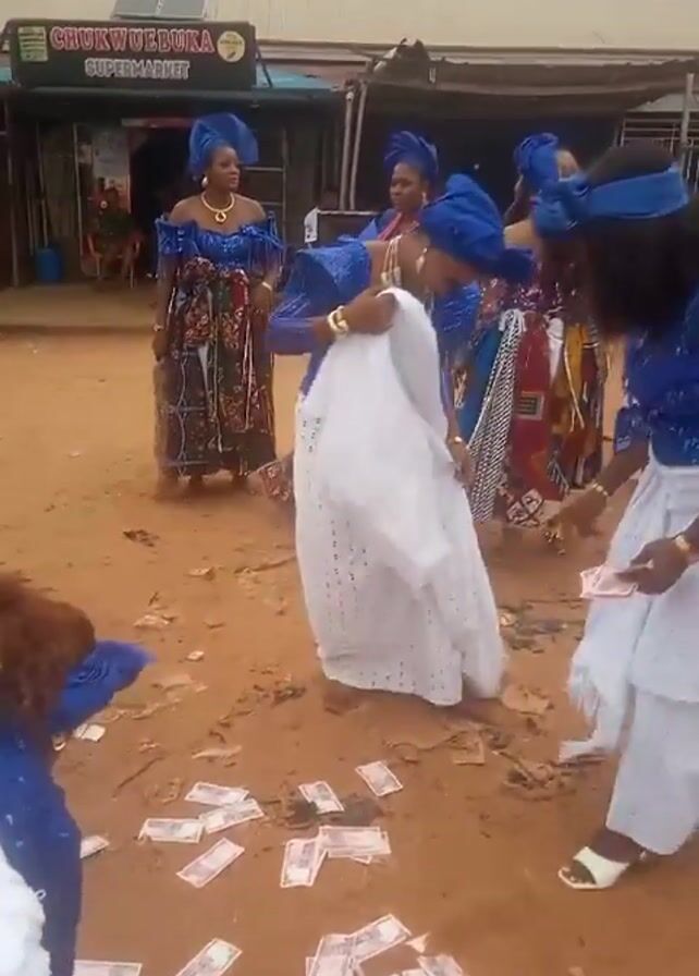 women dancing in a dirt-covered outdoor area. They are wearing matching blue and white outfits, traditional Nigerian clothing, and headwraps. Some women are bending down to gather money scattered on the ground. In the background, a building with the sign "CHUKWUEBUKA SUPERMARKET" is visible, along with a yellow tent and a table with items on it. One of the women is holding a microphone and speaking. The women are smiling and enjoying the celebration.