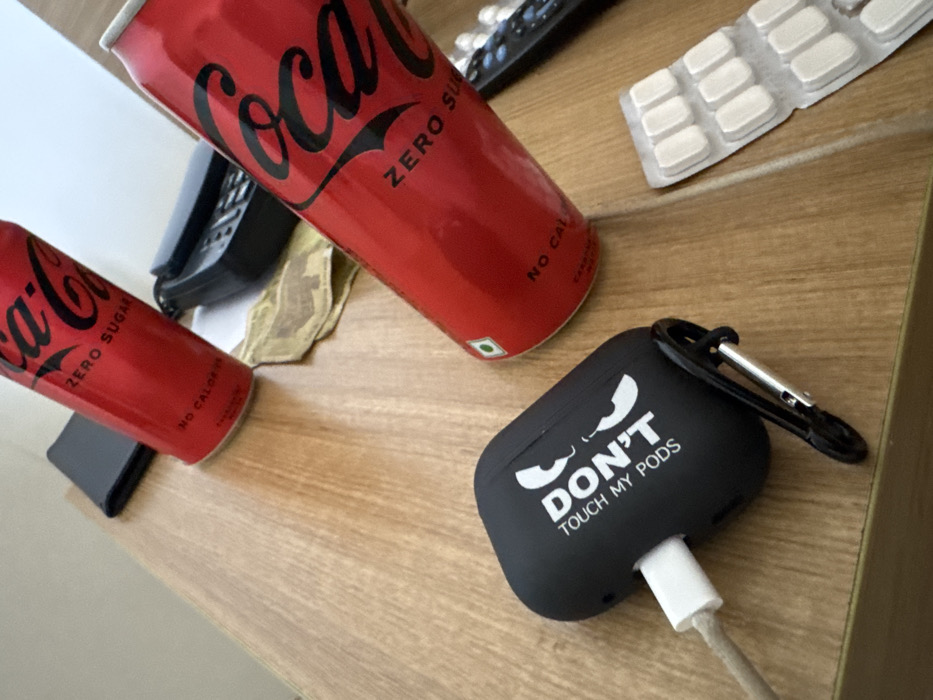 The scene is an indoor setting in Ambala, India, displaying various items arranged on a light brown wooden surface, likely a desk or table. In the foreground, left-center, a black silicone AirPods case is present, connected to a white charging cable. The case features white text reading "DON'T TOUCH MY PODS" along with a stylized white graphic resembling a face with a mustache and eyebrows. A black carabiner clip is attached to the right side of the case. Two red Coca-Cola Zero Sugar cans are positioned on the surface; one is partially visible in the upper-left behind a black wallet or card holder, and the other stands upright in the center-right, displaying a green vegetarian symbol on its label. A partially used white blister pack containing several white, rectangular pills is located in the bottom-right. Other items include a crumpled light brown fabric piece near the center, a black electronic device (possibly a telephone handset) in the upper-center, and a black remote control in the mid-right. No individuals are present in the image.