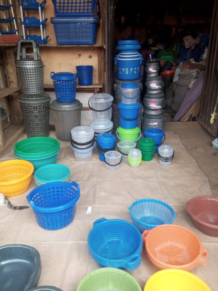 - "The image captures an outdoor market stall or shop entrance in Rigasa, Nigeria, displaying a diverse collection of plastic household items" by FM-Bivw32, licensed under CC BY 4.0